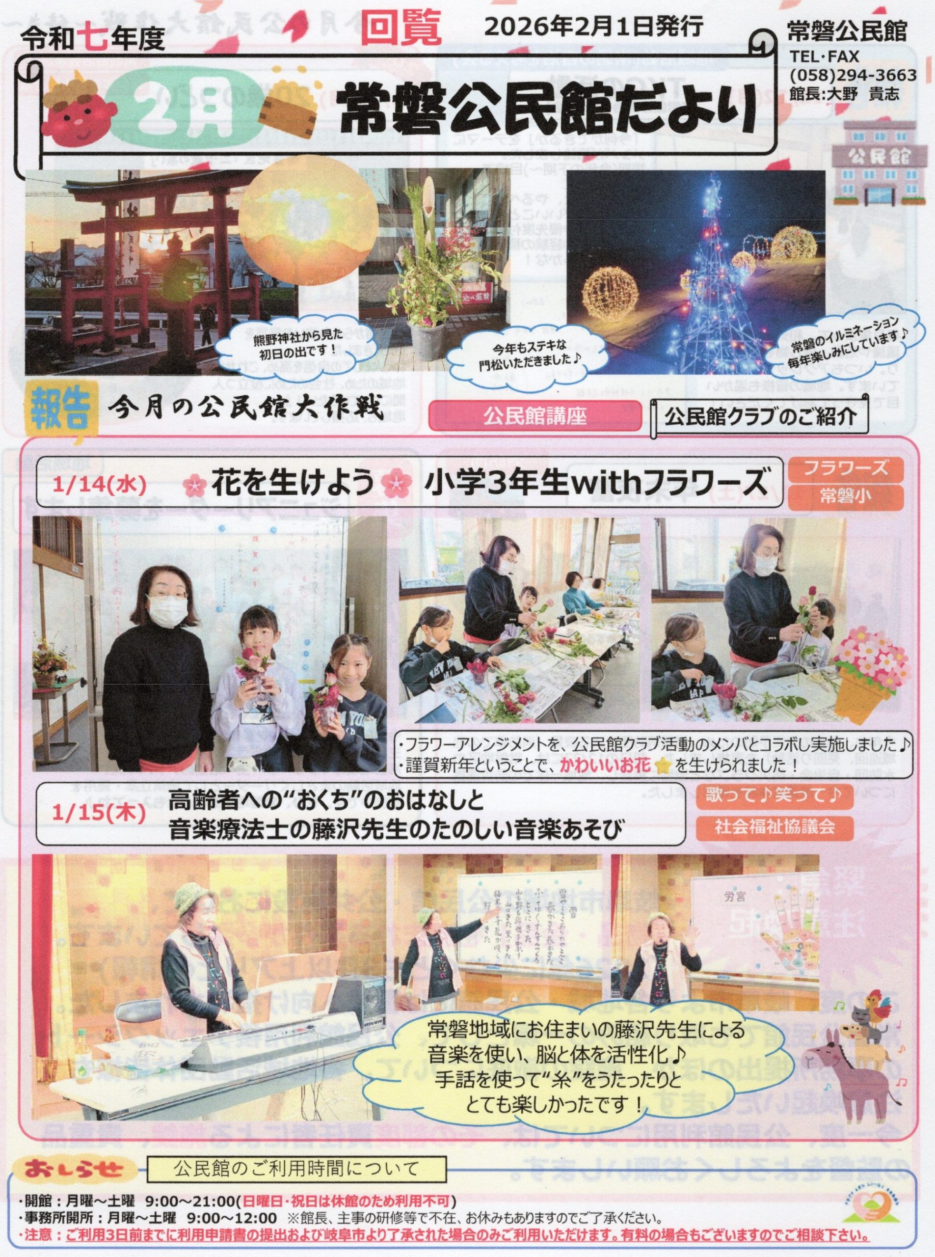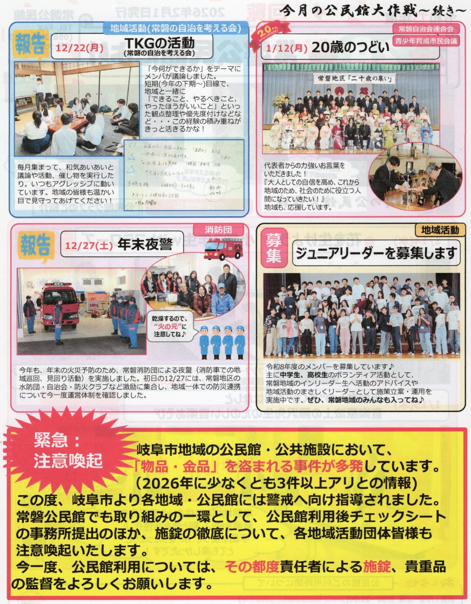 2026年2月1日 / 最終更新日時 : 2026年2月1日 tokimati お知らせ 『R8年2月 公民館だより(2月1日発行)』12月下旬から1月下旬までの活動報告です。緊急:注意喚起各種団体の責任者の方は、公民館利用時の貴重品管理、公民館利用後の施錠管理の徹底を宜しくお願い致します。 「最近の投稿」から選択するとこちらに表示されます。BlueskyCopyコメントを残す コメントをキャンセルメールアドレスが公開されることはありません。 ※ が付いている欄は必須項目ですコメント ※名前 ※ メール ※ サイト 次回のコメントで使用するためブラウザーに自分の名前、メールアドレス、サイトを保存する。 Δ
